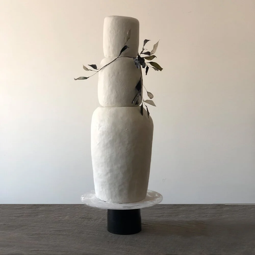 The sculptural creations of Jasmine Rae rivet the eye; how perfectly at home they would look encased in glass, at a museum, as well as on your wedding table. Drawing inspiration from the essential elements and from natural beauty everywhere, Jasmine Rae cakes evoke the movement of water, wind, and blossoms, and explore the intricacy of minerals and manmade structures. Each cake has an architectural feeling to it, and a coolness and elegance that must be experienced to be fully understood. These creations feel alive and abstract—the rice paper floral work more O’Keeffe Iris than predictable peony, the windswept movement of the cakes like a gust of sea breeze or a sweeping, chiffon skirt. Rae seems to work in symbiotic relationship with her cakes, as a skilled Ikebana artist would her flower arrangements, revealing both her touch and her willingness to surrender to what her materials naturally want to do. A quality of listening and responding is evident in these sentient, sensitive pieces. Rae’s exceptional work with rice paper creates diaphanous curtains, gauzy, gossamer shapes, and flowing lines. These cakes feel contemplative and abstract rather than razzle-dazzle, giving off an aura of intellectual beauty.